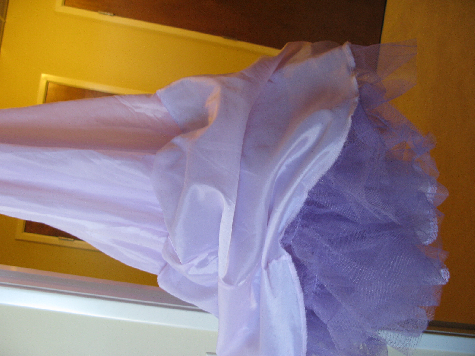 The results were so-so. The tulle part (the fun part!) is a lovely light purple. However, the rest of the crinoline came out a cotton-candy shade of pink. Whoops. I had worried that might happen, as I had read that polyester doesn’t dye particularly well and I really had a hard time finding a crinoline that wasn’t polyester. So now I am left trying to decide whether it’s worth re-dying or going the more dangerous route of cutting the fabric away from the tulle since that’s the part I care the most about anyway.