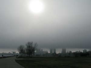 Sun trying to peek through the fog cloaking the shoreline of Lake Michigan. I took these a few minutes before Russ asked me to marry him. 🙂