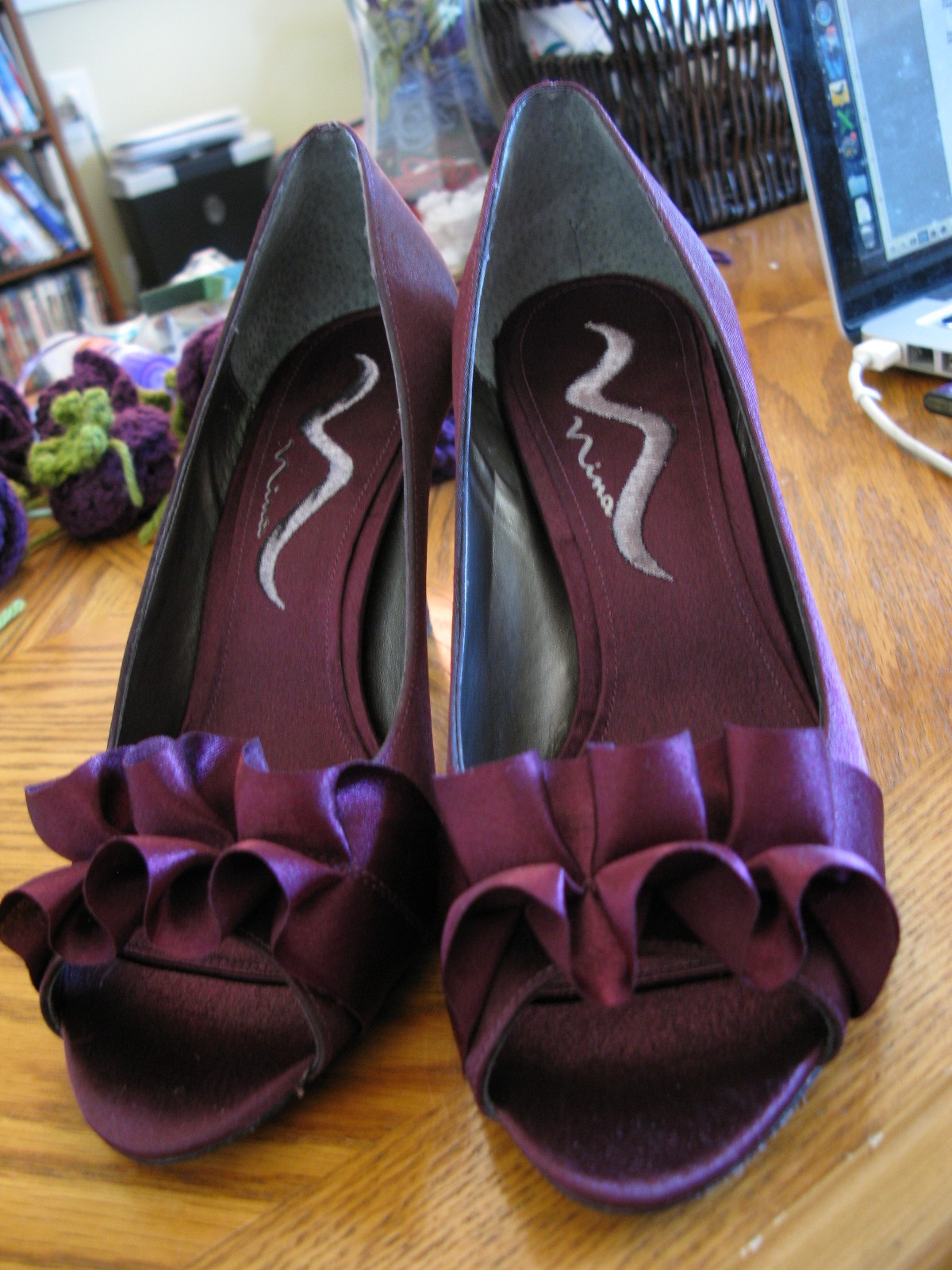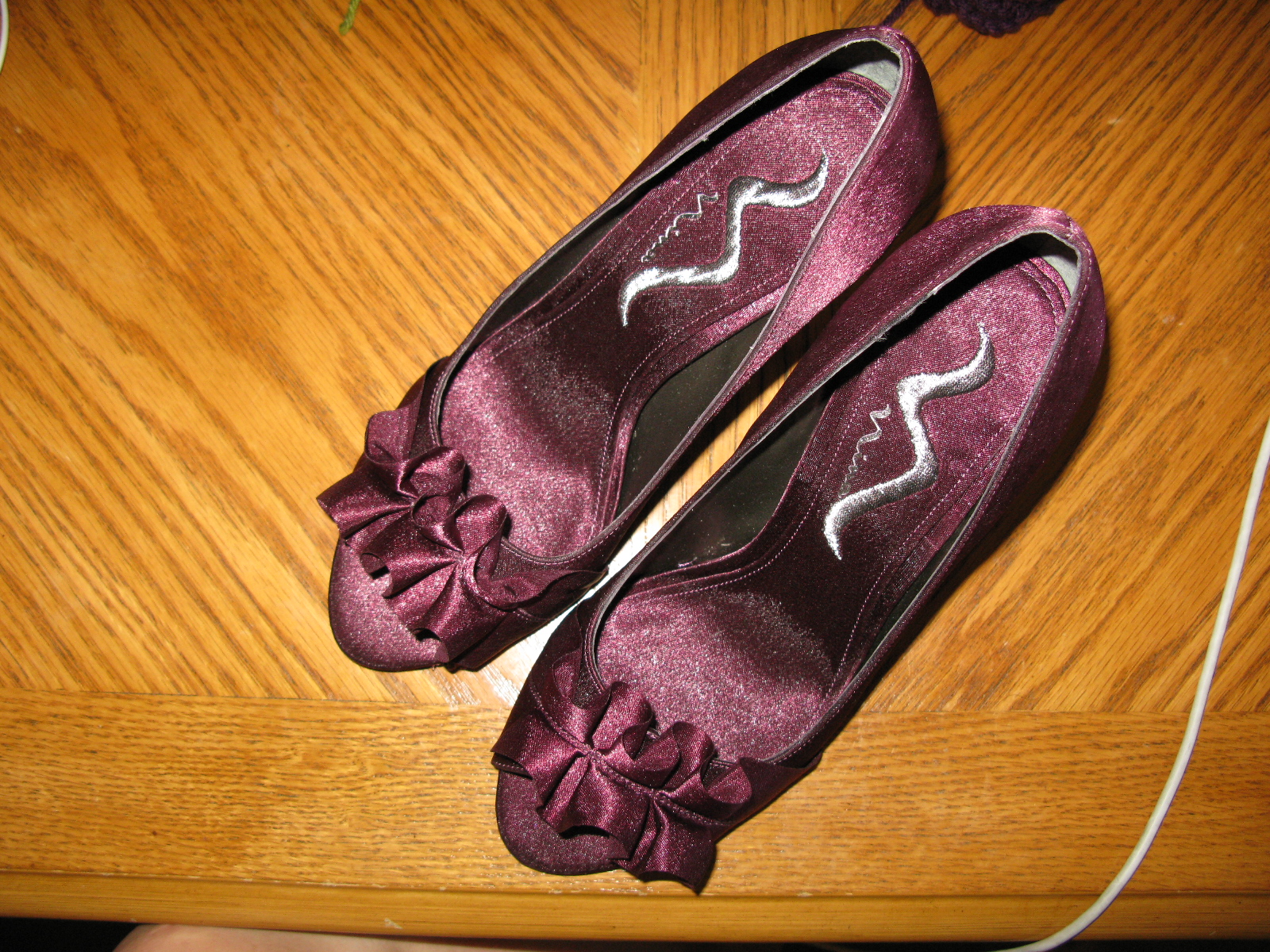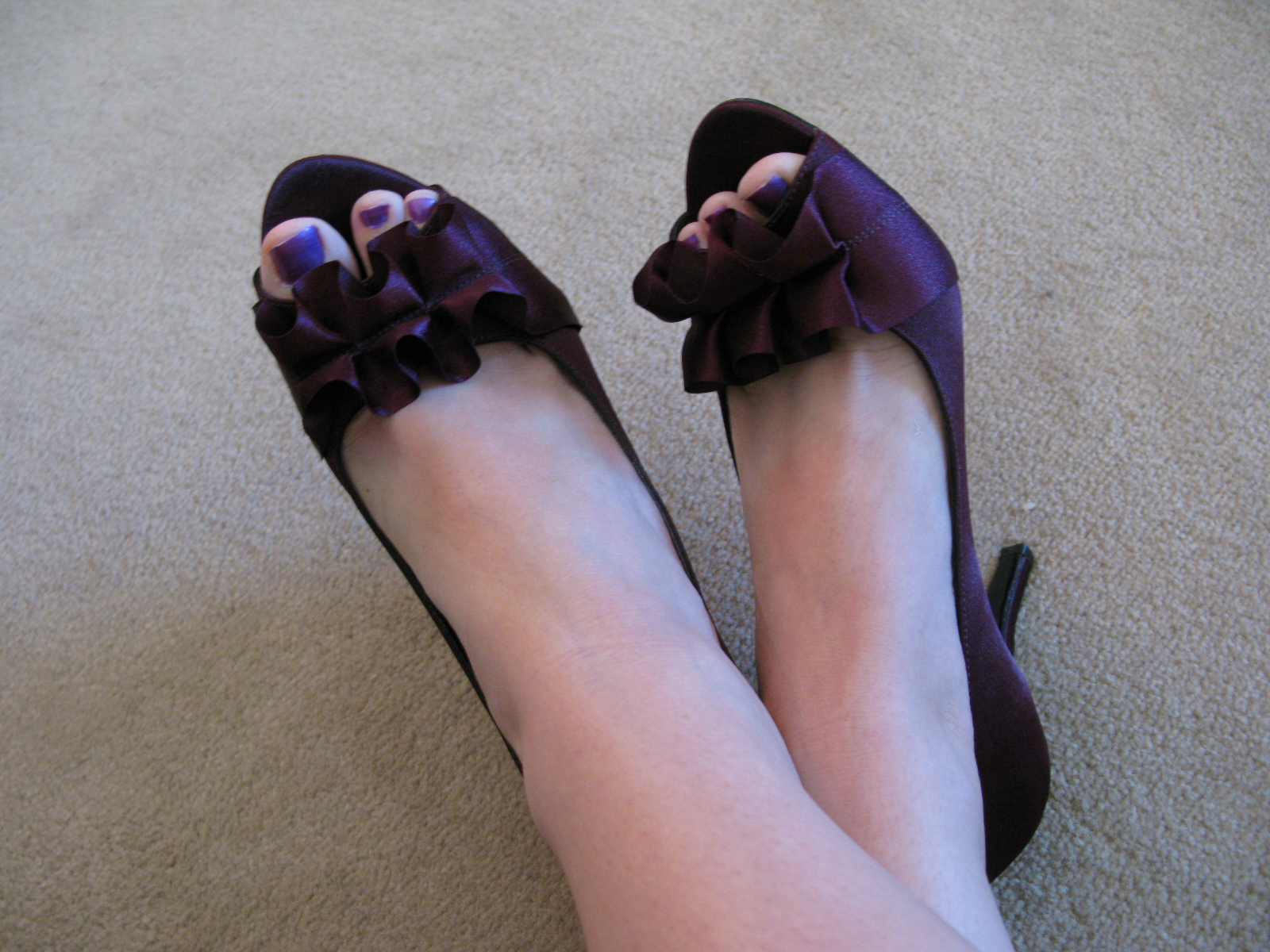 Yes, dozens of department stores and fancy shmancy retail shoe chains and innumerable web searches later, I am the proud owner of the prettiest wedding shoes in all the land. I’ll admit, I might be the slightest bit biased. But really, they are pretty stellar. They’re a rich, glorious, drool-worthy deep purple – a royal purple, some might even say. They’re not too tall and not too short but just the absolute perfect height for dress-to-floor optimization. They’re decadent satin with soft, subtle detailing. Can you tell I’m in shoe love?