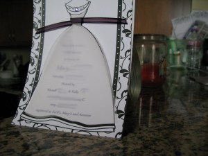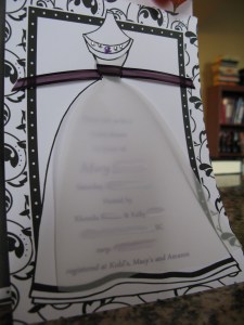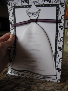 And when I got this little beauty in the mail recently, I may have squealed a little (or maybe a lot). RB jazzed up the bride on this invitation, who apparently originally came with a black sash. She added the purple to go with our color scheme and bedazzled her by adding the fun jewels. I think she did a fabulous job!